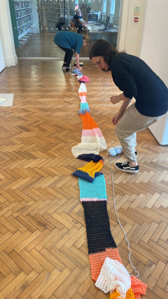 As the crocheted object grew, so did the physical distance between us, yet we remained connected by the yarn throughout. As we worked together, we materially wove the threads of our own grieving processes with the anonymous losses of the people who have donated yarn to charity shops. Dropped stitches and inconsistencies might mark points at which the conversation becoming particularly absorbing, difficult, or joyous. The material of the installation physically marks time, bodily presence and absence, and conversation. The crocheted object is accompanied by 25 fragments of text, which recall notable moments of grief, support, and friendship.